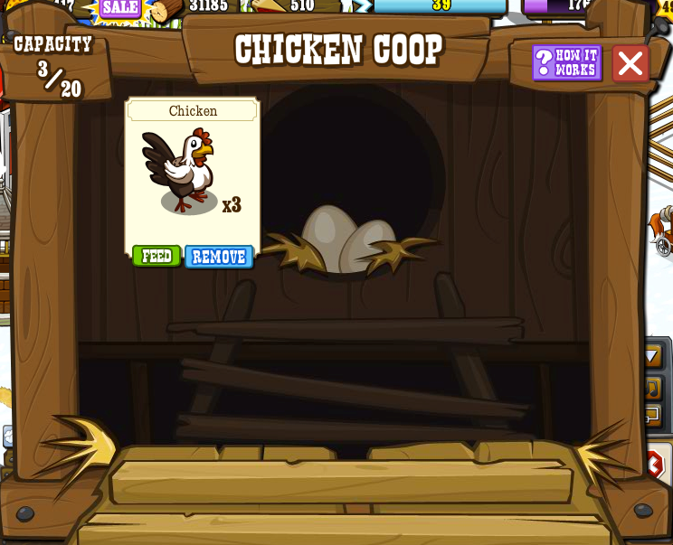 Coops will have 5 levels to upgrade allowing you to store a maximum of 100 Adult Chickens stored per coop. Younger Chickens cannot be stored in coops.