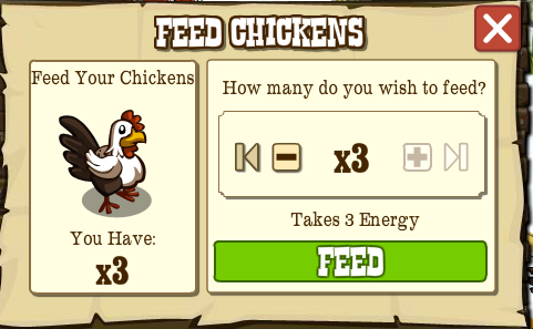 Protected Chickens within the coop are fed using a new Feed Dialog that allows you to select the number of protected chickens that need fed. You will be able to feed a maximum number of chickens equal to your max energy or max capacity
