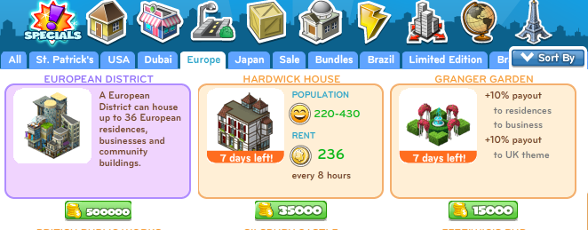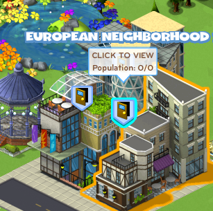 - Once the European District is built, you will see a door icon appear. Click on the European Mall, European Neighborhood or European Civic Center to open their menus.