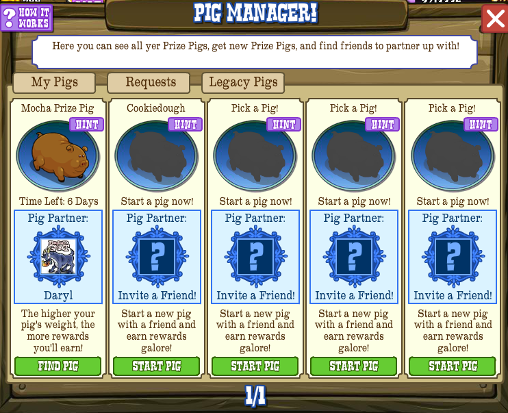 The Pig Manager (accessed by clicking on the Pig Pavilion) where you can see all of the Prize Pigs you’re currently feeding (“My Pigs”), requests from your neighbors to feed their pigs (“Requests) and the Prized Pigs you’ve already weighed (“Legacy Pigs”):
