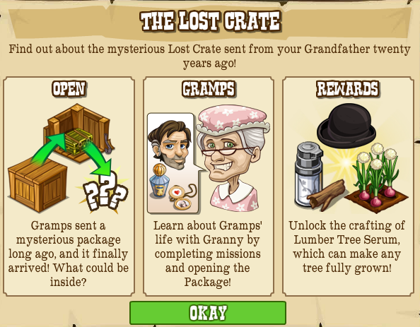 Unlock Gramps' Lost Crate to discover the formula to the Lumber Tree Serum. Convert your chopped sapling trees to fully grown, and fully heal trees!