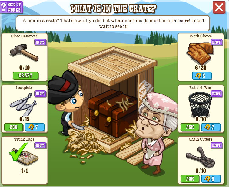 Reward: 600 XP, Unlock Red Onion Crop, Trunk Tags (needed for Crate)