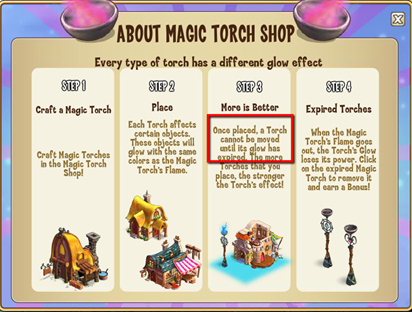 Players are reporting that once they place a Magic Torch (such as the Magic Torch of Romance for the Rule of Magic quest), they find that they are unable to move it. This is actually by design, and noted in the run-up to actually placing the Magic Torch.