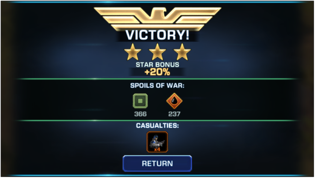 The Battle is completed when you destroy the enemy's Headquarters or when the time runs out. You will receive a pop up confirming your victory (if applicable) and your casualties.