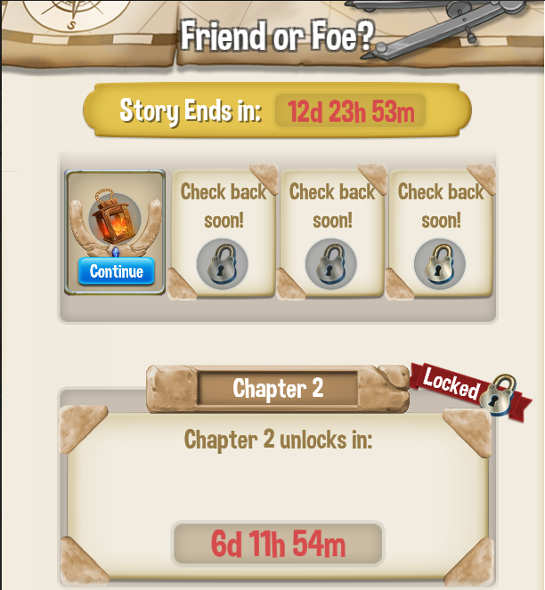 Complete each chapter to earn awesome rewards including new Mystery Rewards and unlock the Ultimate Reward! Each chapter will unlock over time. To see the current chapter, click on the Progress Bar at the bottom of the screen. The first tab of the Event Center shows all the chapters required to complete the event. Quest chapters have a number of quests to complete, and new quests unlock after a certain time. The Day Counter will show you how long until a new chapter series unlocks automatically. You can see more details on a quest by clicking the Continue (if you have started the quest) or Accept (if you have not started the quest) button